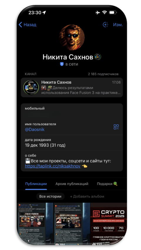 Шаг 2. В свой InOne я собрал ссылку на доступ в чат, поддержку донатов моего канала из Tribute, мой сайт с софтом и обучением, YouTube канал и ещё пару мои ресурсов вместе с гайдами. Вы можете организовать свой InOne как вам хочется, поставить даже гео-метки, добавить иные ссылки, важные сообщение и так далее.