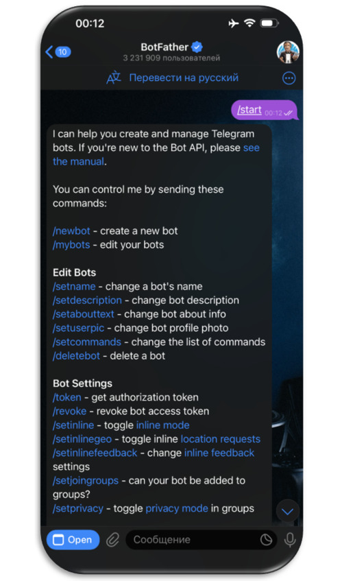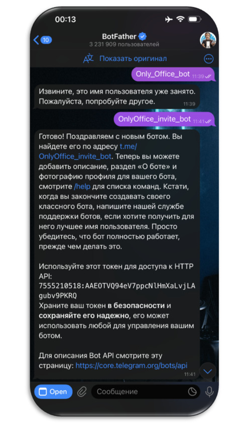 – После создания вы получите токен (например, 123456789:ABCDEF…). Сохраните его.