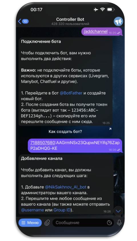 – Найдите подходящего бота: Один из популярных вариантов – @ControllerBot. Это многофункциональный бот для управления каналами.
