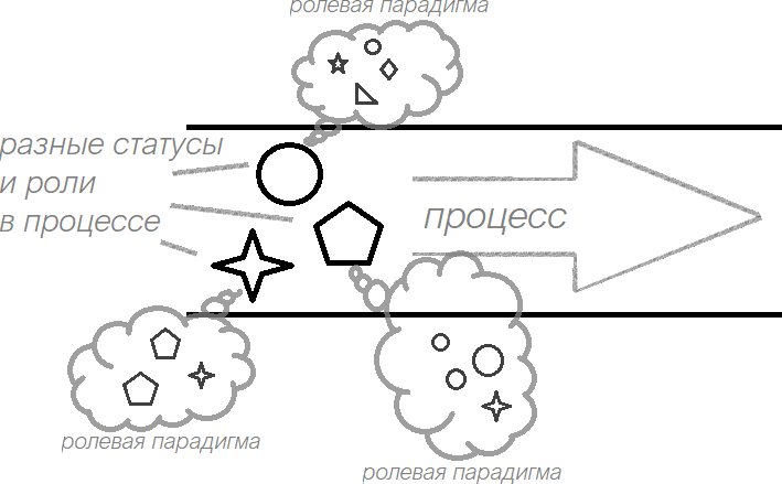 Монографическое исследование будет проходить в следующем контексте: роль, конфликты ролей, роль в конкретном процессе, система и ролевая парадигма, где конфликт – это индикатор процесса, процесс – последовательность действий ролей, направленная на достижение цели, система – группа взаимодействующих и взаимосвязанных ролей, действующих в соответствии с установленными правилами, а ролевая парадигма – шаблон мышления (система знаний) конкретной роли о себе, взаимодействующих ролях и процессе, в котором объединены и выполняются роли (см. рис. 1).