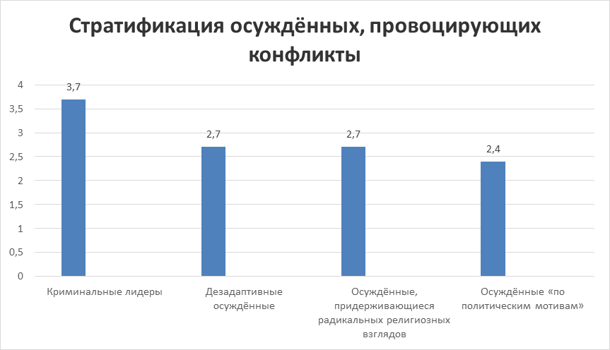 Таким образом, мы определили, что контрсубъекты пенитенциарного конфликта делятся, с одной стороны, на сотрудников и осуждённых, сотрудничающих с администрацией, а с другой – на осуждённых отрицательной направленности, которые в свою очередь делятся на криминальных лидеров, осуждённых, придерживающихся радикальных религиозных взглядов, дезадаптивных осуждённых и т. д. Внешними участниками конфликта могут быть: родственники осуждённых, адвокаты, правозащитные и общественные организации (общественные наблюдательные комиссии), органы прокуратуры, судебные органы, международные организации (Европейский комитет по предупреждению пыток и т. д.). Наибольшую же общественную опасность представляют собой пенитенциарные конфликты с участием криминальных лидеров, осуждённых, придерживающихся радикальных религиозных взглядов, и дезадаптивных осуждённых.