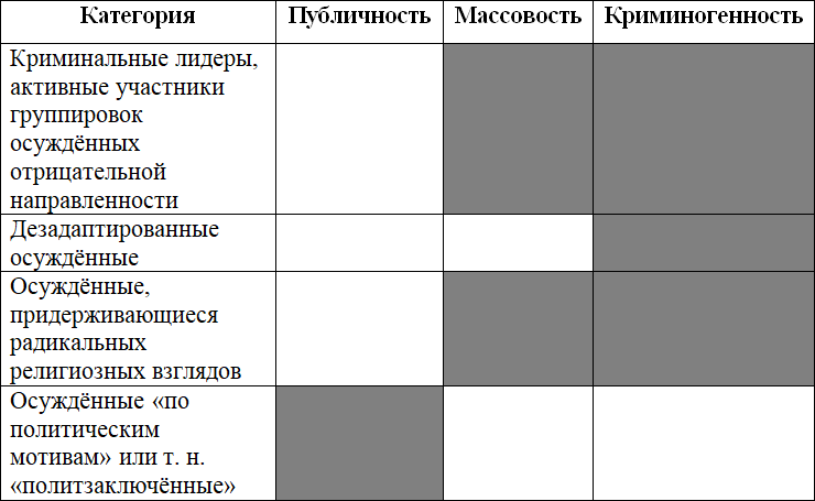 Можно провести параллели, найти сходства и различия между участниками групп осуждённых отрицательной направленности, которые придерживаются норм «криминальной субкультуры», и осуждёнными, придерживающимися радикальных религиозных взглядов. Они схожи своим негативным отношением к общепринятым нормам морали и поведения, а также к установленным законом правилам, но вместе с тем отличаются «идеологически» – у них разные взгляды и ценности. Соответственно, их нельзя рассматривать как партнёров, но можно определить как контрсубъектов пенитенциарного конфликта.
