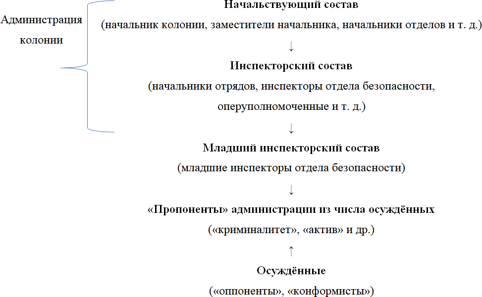 Сращивание руководства колонии и криминалитета отмечается в отдельных учреждениях[129]. Данный принцип архаичной парадигмы поддерживается следующим утверждением: «Главное, чтобы не было происшествий». Использование подобной формы власти основывается на негласном договоре с небольшой группой осуждённых – лидерами или активом. Руководство может формально подходить к предъявлению требований по соблюдению режима к данным лицам в обмен на «послушание» осуждённых.