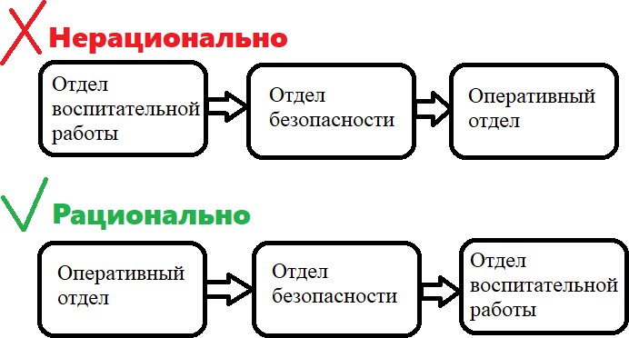 Взаимодействие между отделами и службами представляет собой взаимодействие ролей и является показателем результативности процесса. Это неоспоримо и отмечается большинством авторов[133]. Взаимодействию мешает такой признак архаичной парадигмы, как выделение нужных (важных) и ненужных (неважных) подразделений. На практике же встречаются колонии, в которых приоритет отдаётся режимным подразделениям, а остальные считаются вспомогательными. Это негативно сказывается на пенитенциарном процессе в конкретном учреждении. Подобный признак формируется из-за непонимания сотрудниками пенитенциарного процесса и его подпроцессов. Не учитываются исходные параметры, неверно трактуются результаты. Здесь нужно отметить, что все подразделения одинаково важны и должны быть единым целым, при этом каждый человек должен чётко понимать, какую роль он выполняет для достижения общего результата.