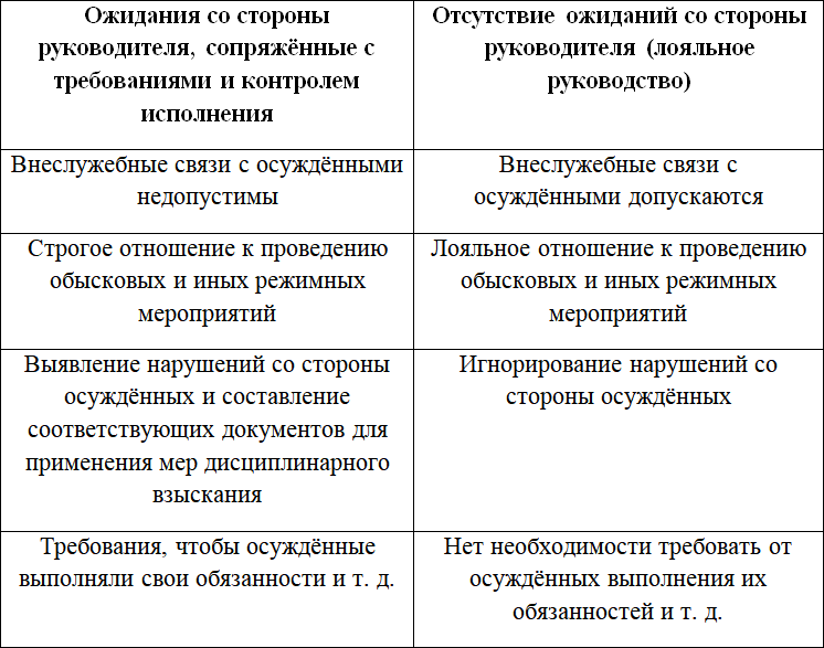 Требовательное руководство станет следить за выполнением своих поручений, а лояльное не будет контролировать сотрудников. Учитывая, что работники колонии проходят службу в системе со строго выстроенной иерархией, данный факт является определяющим. В конечном итоге в цепочке звеньев руководителей отсутствие требований и контроля означает отсутствие необходимости у работника качественно выполнять свои обязанности.