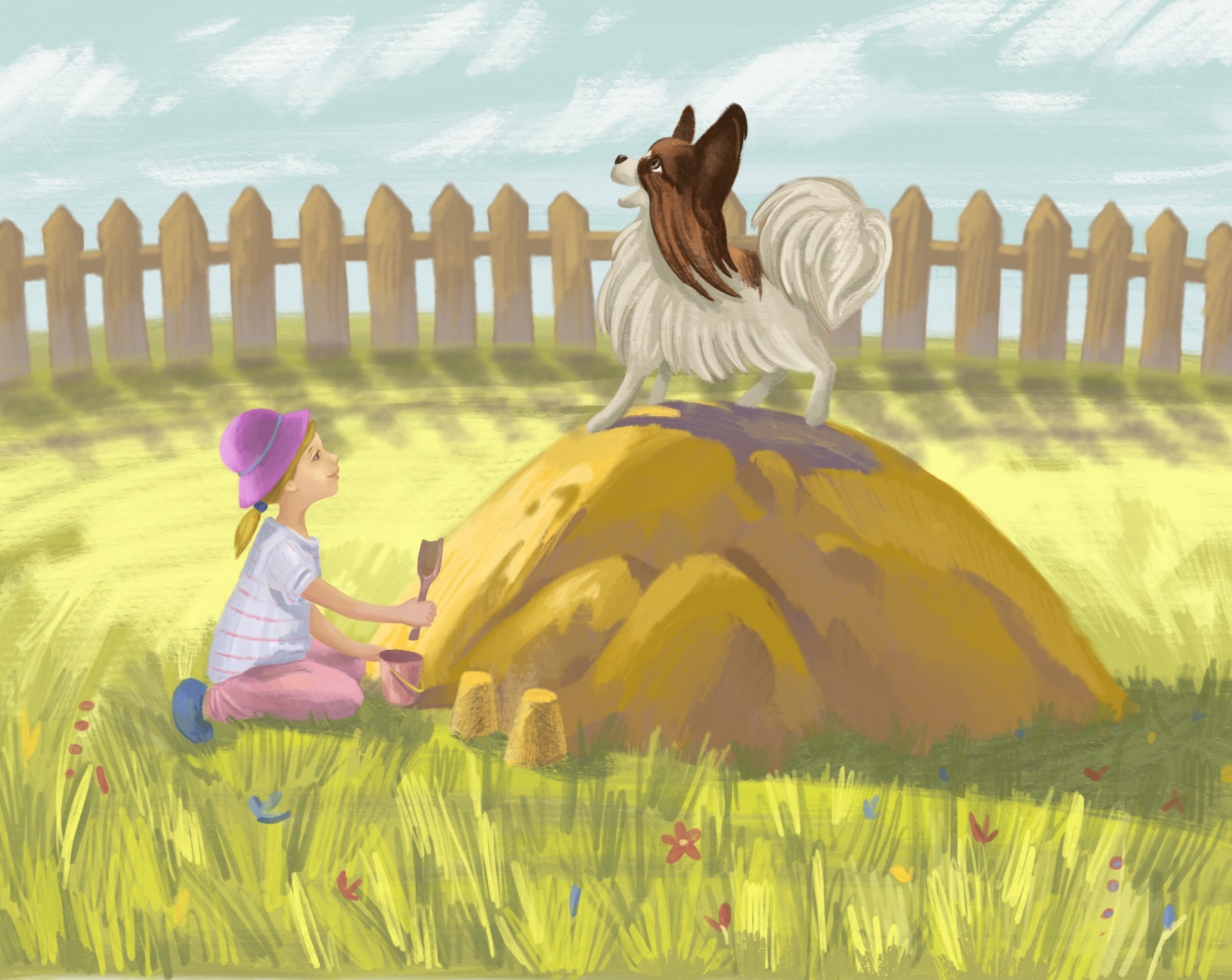 Микки перелаивался с ними очень долго. Наконец, Хозяйке это надоело, и она позвала его. Подняв Микки с земли, она усадила его к себе на коленки и стала чесать за ушком. Соседские собаки еще продолжали гавкать в отдалении, но он уже не обращал на них внимания. Ему было хорошо и приятно. Он высунул язык и прищурился от удовольствия. Тут взгляд его упал на маленькую Хозяйку Настю. Она сидела у большой кучи песка и что-то с ней делала. Микки еще никогда не видел такой большой кучи, она показалась ему размером с гору. Он удивился, почему не заметил ее раньше, и решил, что надо срочно кучу исследовать. Он начал ерзать на хозяйкиных коленках и просить, чтобы его спустили на землю. Хозяйка опустила его, и, встряхнув ушками и гордо подняв хвостик, Микки рванул к загадочной горе.