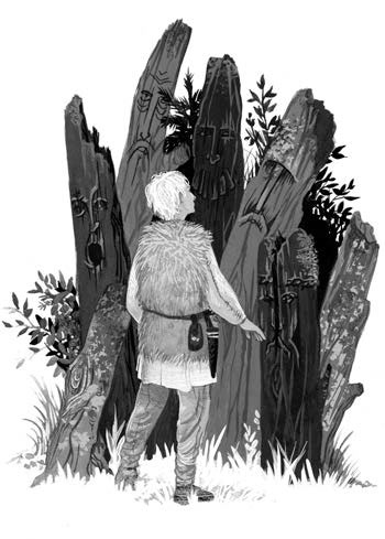За кувасами располагались сушила для рыбы. Сейчас перекладины были пусты, если не считать одинокой крохотной пташки светло-жёлтого окраса, которая прыгала туда-сюда, перепархивала с жерди на жердь, чёрным глазом посматривая на двуногих пришельцев, нечаянно или намеренно потревоживших её. При приближении Пойкко птичка звонко пискнула и упорхнула. Пойкко посмотрел на проглядывающее сквозь прорехи в еловых кронах голубое небо, прищурился от игры солнечных бликов, затем опустил глаза и проморгался от выступивших слёз. Нечаянно взгляд его упал на странно выступавшие позади сушил из зелёного моха обрубки древесных стволов. Продолжая вглядываться в них, он неуверенно пошёл вперёд. Все они были разной высоты, некоторые едва доставали до пояса взрослому человеку, другие были выше головы. Одни, образовывая тесный ряд, скопом завалились на одну сторону, в то время как другие, более длинные, беспорядочно торчали как попало.