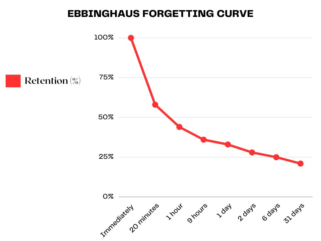 Если было бы так легко, все бы уже выучили не один, а 5-10 языков. Но почему это не работает? Когда вы видите или слышите новое слово, оно попадает во временную память. Создаётся обманчивое ощущение, что вы никогда не забудете это слово. Но всё наоборот. Согласно исследованию университета Гарвард3, временная память хранит от 5 до 9 единиц информации, в нашем случае: 5-9 слов. Во-вторых, она очень короткая: 15-20 секунд. Даже если вы попытаетесь запомнить эти слова, то согласно кривой забывания Эббингауза (рис. 1), через 20 минут вы забудете почти половину информации.