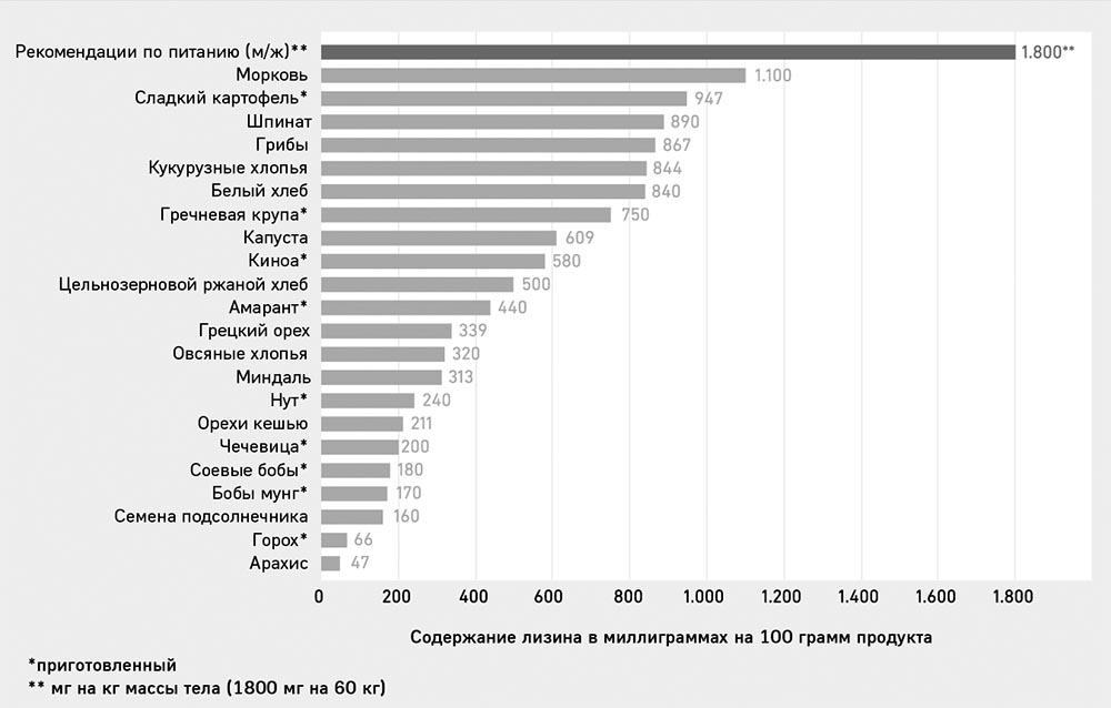 Растительные продукты с низким содержанием лизина сами по себе не являются бесполезными, поскольку некоторые из них богаты многими другими важными питательными веществами. Однако они не вносят существенного вклада в обеспечение организма лизином, поэтому их следует ежедневно сочетать с богатыми этой аминокислотой продуктами. Если кто-то не ест бобовые, то потребность в лизине можно восполнить с помощью некоторых псевдозерновых культур, например киноа и амаранта, в сочетании с орехами, такими как кешью и миндаль, или обезжиренной ореховой мукой. Однако благодаря огромной пользе бобовых их лучше есть, по возможности, каждый день или как минимум несколько раз в неделю.