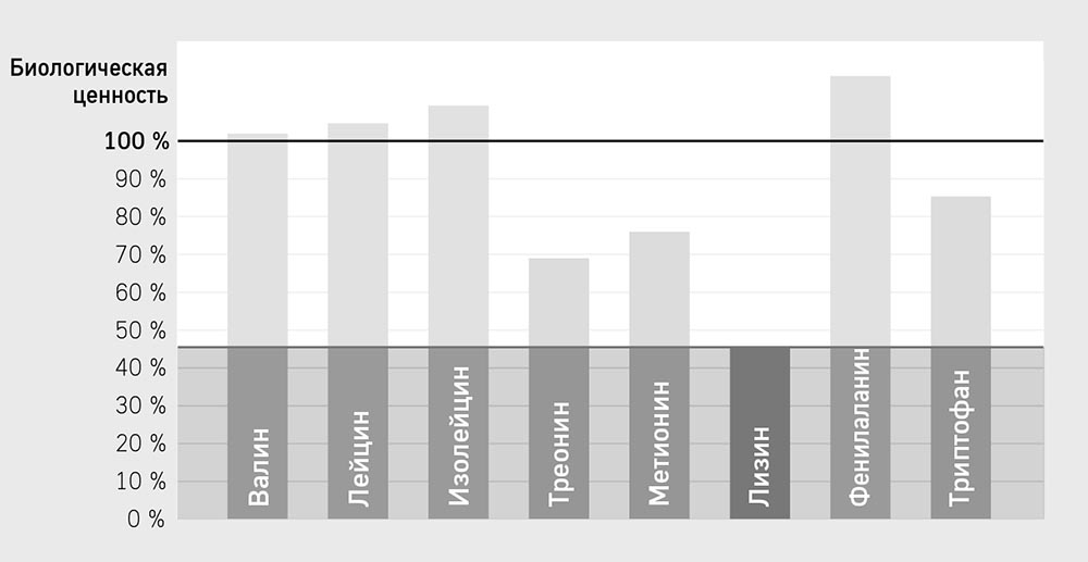 Если к зерну добавить очень богатый лизином продукт, который полностью компенсирует его нехватку, то это приведет к увеличению ценности белка до тех пор, пока мы не столкнемся со следующей лимитирующей аминокислотой, которой в нашем примере является треонин. Если дополнительный, так называемый «комплементарный белок» обеспечивает достаточное количество не только лизина, но и треонина, то ценность снова увеличится, пока мы не столкнемся с дефицитом следующей лимитирующей аминокислоты, которой в данном примере является метионин, а затем триптофан. Если комплементарный белок также может обеспечить достаточное количество этих аминокислот, то два белка дополняют друг друга и достигается оптимальная биологическая ценность. Теоретически она может быть даже выше 100 %.