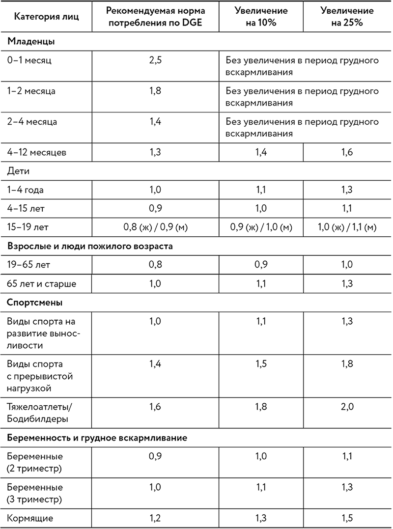 Как видно из табл. 1, во время беременности и грудного вскармливания потребность женщин в белке возрастает. Если потребность в некоторых питательных веществах во время беременности увеличивается вдвое, то в отношении белка все несколько иначе. Рекомендуемое суточное потребление белка возрастает лишь на 20 % во время беременности и на 35 % во время грудного вскармливания. Нормы были скорректированы в сторону увеличения в соответствии с рекомендациями для беременных женщин, придерживающихся веганского образа жизни [67]. Потребность в белке у младенцев, безусловно, самая высокая по отношению к их массе тела, но белок в достаточном количестве поступает с молоком матери в течение первого полугода исключительно грудного вскармливания [68].