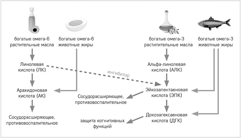 Поэтому потребление большого количества длинноцепочечных жирных кислот омега-3 ассоциируется с положительным для здоровья противовоспалительным и сосудорасширяющим эффектом, в то время как повышенное потребление АК оказывает противоположное действие, вызывая воспаления и сужая сосуды [54]. Жирные кислоты омега-3 и омега-6 взаимно влияют друг на друга и могут рассматриваться как антагонисты. По этой причине, особенно в ранних публикациях, большое внимание всегда уделялось взаимосвязи жирных кислот омега-3 и омега-6, хотя результаты более поздних исследований указывают на необходимость дифференцированного подхода к изучению этих жирных кислот [55]. Вероятно, следует рассматривать не общее потребление и взаимное соотношение всех жирных кислот омега-3 и омега-6 в целом, а лишь соотношение и общее потребление отдельных жирных кислот из этих двух групп [56].