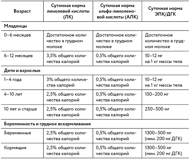 Если в период грудного вскармливания мать в достаточной степени обеспечена всеми незаменимыми жирными кислотами, а также ДГК за счет добавления масла из микроводорослей, ребенок также получает достаточно ДГК с грудным молоком [68]. Если ребенок не находится на грудном вскармливании, ему требуется отдельный источник ДГК. Чтобы обеспечить поступление ДГК в организм, ее часто добавляют в детские смеси на растительной основе. Однако если продукт не содержит ДГК, рекомендуется добавлять ее в пищу в количестве 10–12 мг на 1 кг массы тела.
