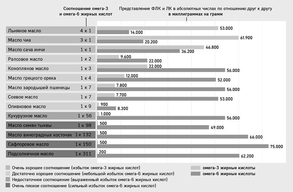 Однако следует знать не только о лучших источниках омега-3, но и о тех продуктах, которые содержат непропорционально большое количество ЛК и поэтому могут нарушить желаемое соотношение ЛК и AЛК. Необходимо уменьшить употребление таких продуктов. В первую очередь это касается масел с особенно высокой концентрацией ЛК, таких как сафлоровое, масло из виноградных косточек, тыквенных семечек, маковых семян, зародышей кукурузы и, прежде всего, подсолнечное масло. Последнее, в частности, содержится во многих продуктах питания, и лишь некоторые растительные спреды, растительные молочные смеси, готовые соусы и другие полуфабрикаты не содержат подсолнечного масла. Следует также значительно сократить количество полуфабрикатов, поскольку они часто содержат большое количество соли, жиров, муки, сахара, а также являются высококалорийными и имеют низкую энергетическую ценность.