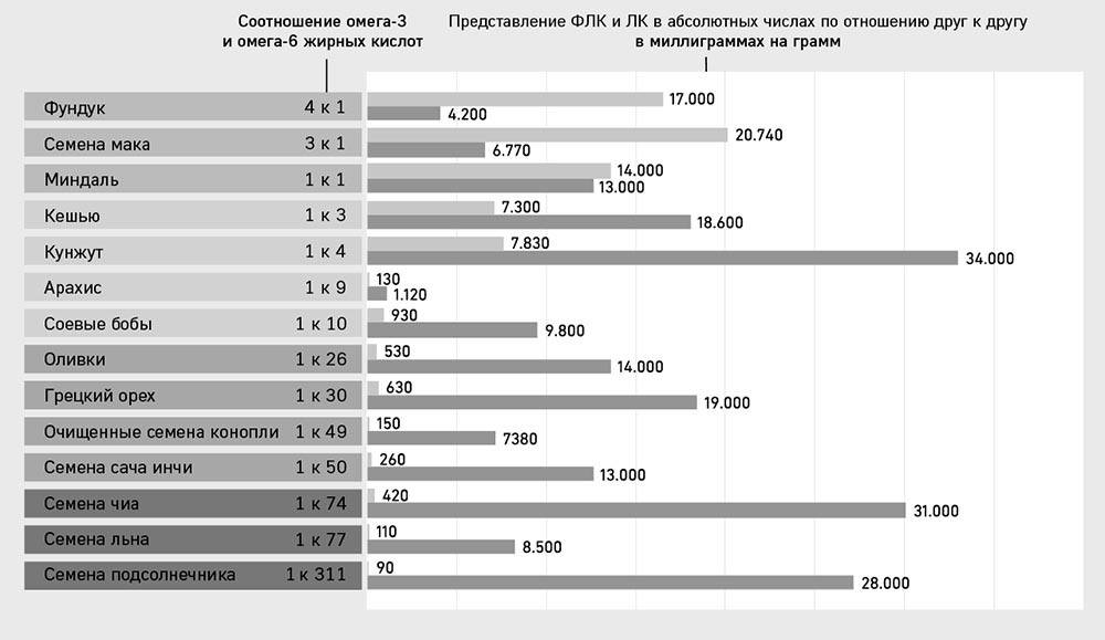 Однако это не означает, что следует отказаться от полноценных продуктов с высоким содержанием омега-6, таких как подсолнечные или тыквенные семечки, ведь в них содержится много белка, клетчатки и других полезных веществ, а содержание омега-6 не так велико, как в обычном подсолнечном масле. Несмотря на то что спектр жирных кислот в семенах подсолнечника или тыквы аналогичен их содержанию в масле, эти семена содержат целый ряд дополнительных ценных веществ. Более того, и те и другие – не только вкусные, но и очень недорогие и легкодоступные источники питательных веществ по сравнению с орехами, которые можно продолжать включать в свой рацион. Однако употребление семян подсолнечника или тыквы не должно идти в ущерб, например, семенам льна или конопли, поскольку их ежедневное потребление является важным компонентом сбалансированной диеты с оптимальным содержанием омега-3.