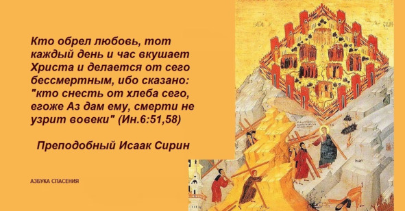 Кто обрел любовь, тот каждый день и час вкушает Христа и делается от сего бессмертным, ибо сказано: кто снесть от хлеба сего, егоже Аз дам ему, смерти не узрит вовеки (Ин.6:51,58). Блажен, кто вкушает от хлеба любви, который есть Иисус. А что вкушающий любви вкушает Христа, сущего над всеми Бога, о сем свидетельствует Иоанн, говоря: Бог любы есть (1Ин.4:8,16). Итак, живущий в любви пожинает жизнь от Бога и в этом еще мире, в ощущаемой здесь, обоняет оный воздух воскресения. Сим воздухом насладятся праведные по воскресении. Любовь есть царство, о ней Господь таинственно обетовал Апостолам, что вкусят ее в царстве Его. Ибо сказанное: да ясте и пиете на трапезе царствия Моего (Лк.22:30), что иное означает, как не любовь? Любви достаточно для того, чтобы напитать человека вместо пищи и пития. Вот вино, веселящее сердце человека (Пс.103:15). Блажен, кто испиет вина сего! Испили его невоздержные и устыдились, испили грешники и забыли пути преткновений, испили пияницы и стали постниками, испили богатые и возжелали нищеты, испили убогие и обогатились надеждою, испили недужные и стали сильны, испили невежды и умудрились.