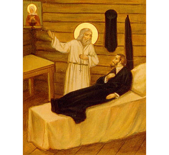 У одной женщины предсмертно занемог муж. Почитая батюшку, он отправил в Саров свою жену. Батюшка никого не принимал. Но, прозрев духом горе людское, он неожиданно раскрыл дверь и прямо обратился к скорбящей: – Дочь Агриппина, подойди ко мне скорее, потому что тебе нужно поспешить домой. Потом, взяв ее руку, положил на плечо свое, где она осязала большой крест. – Вот, дочь моя, – сказал старец, – сперва мне было тяжело носить это, но ныне весьма приятно. Спеши же теперь и помни мою тяжесть. Прощай! Муж еще был жив, принял присланного о. Серафимом вина, антидора и святой воды, благословил детей и мирно отошел ко Господу.