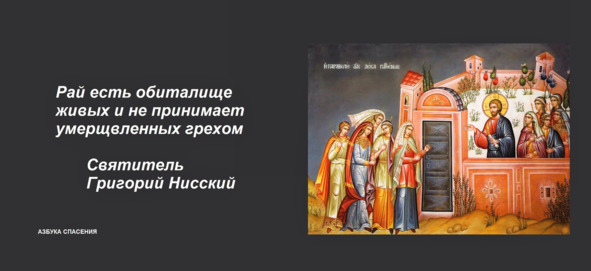 Но поскольку рай есть обиталище живых и не принимает умерщвленных грехом, мы же «плотяны» и смертны и проданы под грех (Рим.7:14), то как может быть на земли живых (Пс.26:13; 114:9) тот, кто находится под владычеством смерти? Какой путь и способ можно придумать, чтобы освободиться от этого владычества? Евангельское учение и для этого предлагает вполне достаточное руководство. Мы слышали слова Господа к Никодиму, что рожденное от плоти плоть есть, а рожденное от духа дух есть (Ин.3:6), знаем также, что плоть за грех подпала под власть смерти, Дух же Божий нетленен, животворящ и бессмертен.