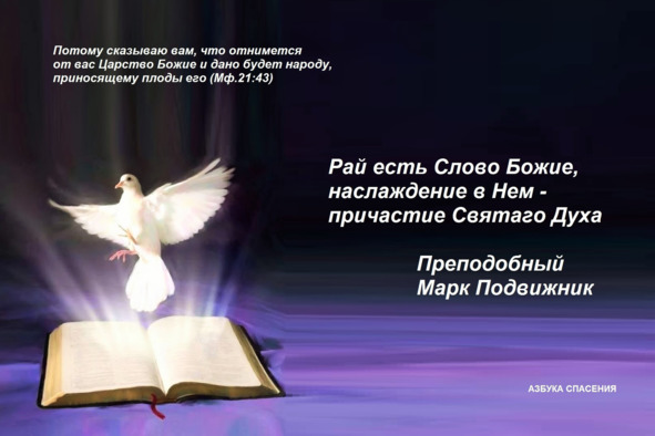 Итак, когда услышишь Писание, поведающее относительно рая, Адама и змия, внимай бесстрастно своему сердцу, и найдешь, что рай есть слово Божие, наслаждение в нем причастие Святого Духа; змий же, убивающий преслушанием, есть пресмыкающееся сладострастие, чрез дружество приползающее и прельщающее нас вкусить от древа (запрещенного), то есть от попечения житейского, ибо сказано: не пецытеся убо на утрей (Мф.6:34). Так же оба запрещения совокупно сказал Один и Тот же Бог: в онъже аще день снесте от древа, смертию умрете (Быт.2:17), и: внемлите, да не отягчают сердца ваша объядением (Лк.21:34); потому что тьма, бывающая от объядения и попечения житейского, умерщвляет душу, изгоняя ее из духовного слова и лишая Божественного действия. Итак, от сего Древа воспрещает нам Господь вкушать, говоря: ни о чемже пецытеся, только о Царствии. Ибо те, которые вошли в сей рай Божий и сохранили сию заповедь, не были изгнаны, но, удержав себя от земного, сторицею насладились духовного, будучи действенно и подобообразно утешаемы благодатью.