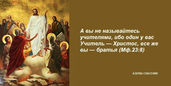 А вы не называйтесь учителями, ибо один у вас Учитель – Христос, все же вы – братья, и отцом себе не называйте никого на земле, ибо один у вас Отец, Который на небесах, и не называйтесь наставниками, ибо один у вас Наставник – Христос. Больший из вас да будет вам слуга: ибо, кто возвышает себя, тот унижен будет, а кто унижает себя, тот возвысится (Мф.23:1—12).