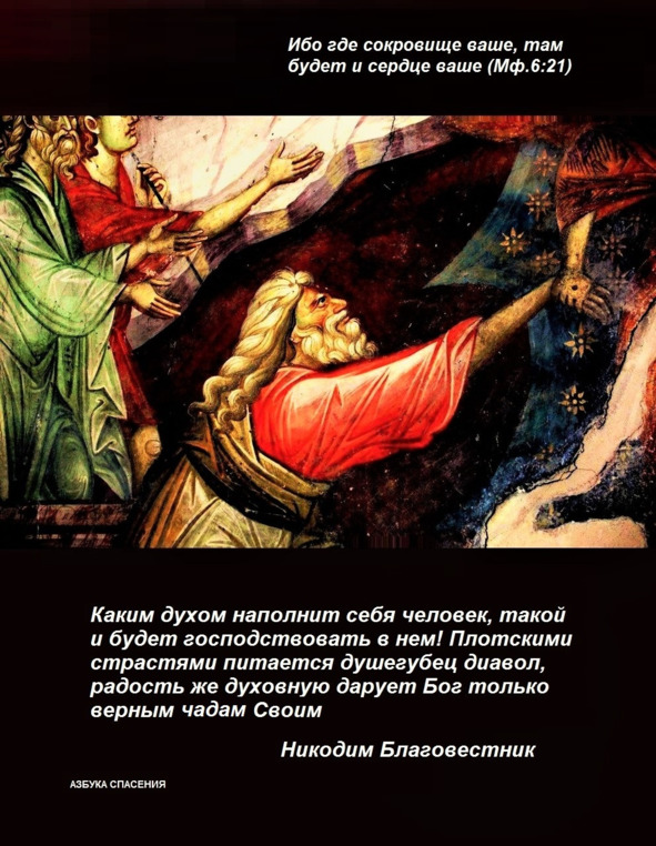 Не собирайте себе сокровищ на земле, где моль и ржа истребляют и где воры подкапывают и крадут, но собирайте себе сокровища на небе, где ни моль, ни ржа не истребляют и где воры не подкапывают и не крадут, ибо где сокровище ваше, там будет и сердце ваше (Мф.6:19—21).