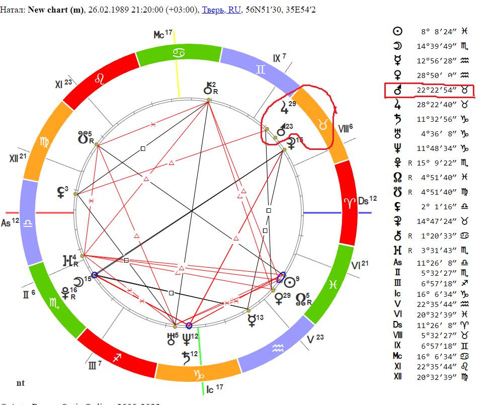 Итак, теперь вы видите личную натальную карту. Нам необходимо найти знак Марса в правой табличке и непосредственно на самой карте (выделено красным).