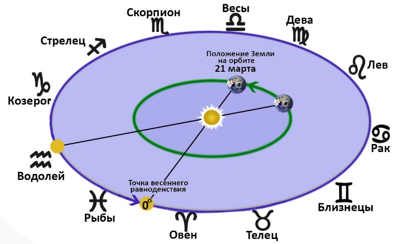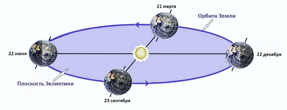 В тех местах орбиты, которые Земля проходит 21 марта и 23 сентября, оба полушария Земли освещаются Солнцем одинаково: на всех широтах Земли продолжительность дня равна продолжительности ночи – это дни весеннего и осеннего равноденствий. Точка Эклиптики, в которую проектируется Солнце в день весеннего равноденствия при наблюдении с Земли, называется точкой весеннего равноденствия.