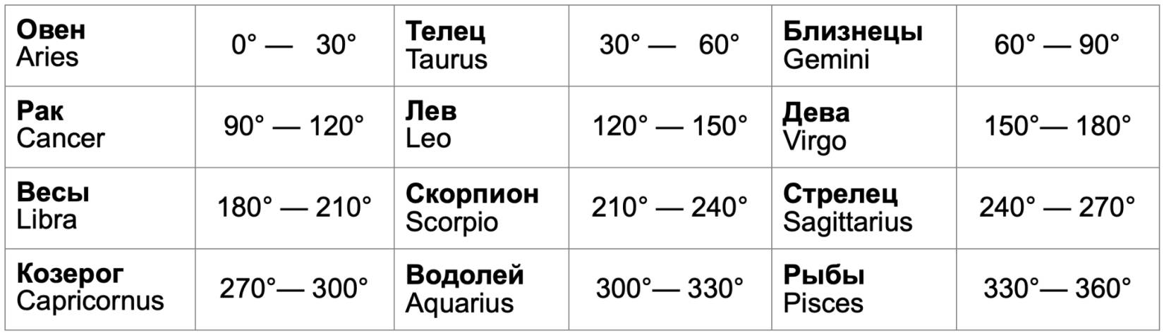 В таблице приводится список знаков Зодиака с указанием их латинского названия и с указанием участков Эклиптики, занимаемых каждым Знаком.