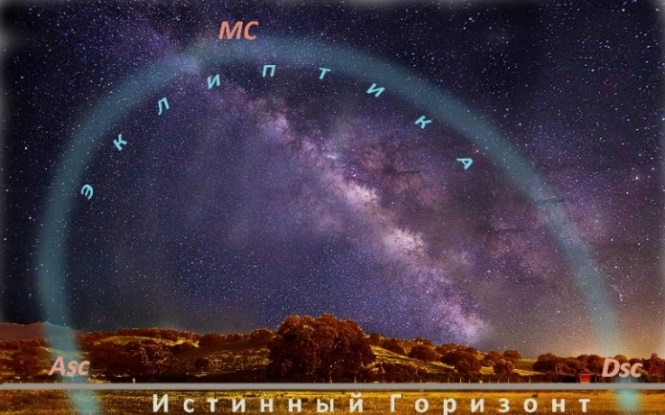 Рис. 4 даёт представление о природе этих важнейших точек в системе домификации. В реальности горизонт представляет собой круг, а точки Asc и Dsc расположены диаметрально противоположно друг другу, поэтому изображение местности следует воспринимать, как панораму. В более строгой форме и более подробно сведения о Домах, а также о связанных с ними понятиях даётся в ПРИЛОЖЕНИИ (Часть I).