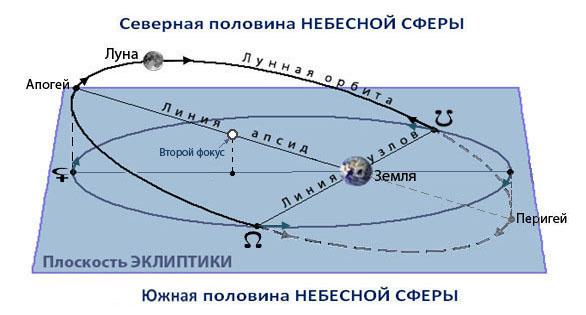 Лунные узлы образуются при пересечении лунной орбиты с плоскостью Эклиптики (рис.5). Точка орбиты, в которой Луна, в процессе своего движения вокруг Земли должна переходить в северную половину Небесной Сферы, называется Восходящим Узлом или Северным Узлом (☊), или, согласно индийской астрологии, Головой Дракона – Раху. На противоположной стороне лунной орбиты расположена точка, в которой Луна должна переходить в южную половину Небесной Сферы – это Нисходящий Узел или Южный Узел (☋), который, согласно индийской астрологии, называют Хвостом Дракона или – Кету. Лунные Узлы лежат на прямой, которую называют линией узлов.