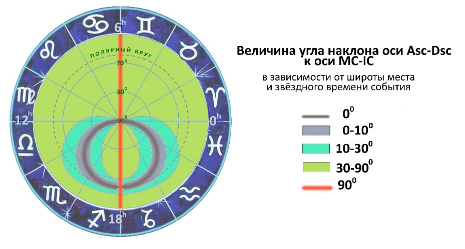 Следует отметить, что в 6 часов и 18 часов звёздного времени, когда Небесный Меридиан какого-либо Горизонта проходит через начало Знаков Рак или Козерог (в точках наибольшего наклона Земной Оси к плоскости Эклиптики) – угол между осями Asc-Dsc и MC-IC на всех широтах равен 90º.
