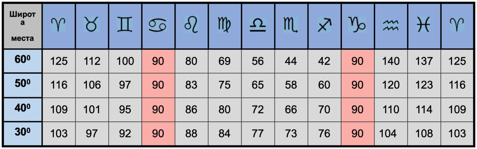 Симуляция изменения положения Горизонта в Круге Зодиака в процессе вращения Земли вокруг своей оси (на астропроцессоре ZET 9) показывает, что сектора между угловыми точками (вне зависимости от широты места) «сжимаются» и вновь «растягиваются», как это видно из нижеследующей таблицы, в которой представлены величины углов между положениями MC и Asc на различных широтах, рассчитанные на положение MC в начале каждого Знака.