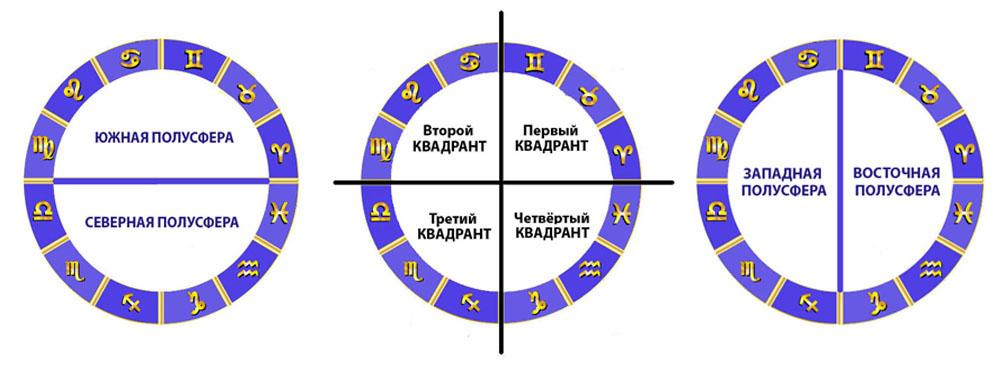 Первый КВАДРАНТ образуется при пересечении Южной и Восточной Полусфер (Знаки: Овен, Телец, Близнецы).