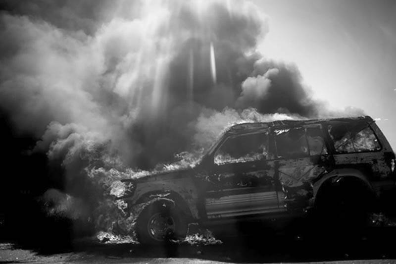 Горящий легковой автомобиль, подбитый на трассе Луганск – Краснодон