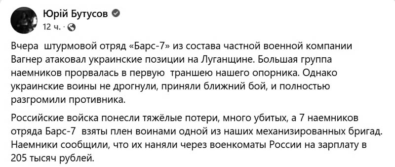 Пропагандист Бутусов[24] оседлал любимую тему украинской и в целом западной пропаганды – ЧВК «Вагнер». Расчет понятен и очевиден – запугать публику баснями о том, что одно из самых известных в мире соединений якобы терпит поражение в боях с «второй армией Европы». Чисто на потребу толпе.