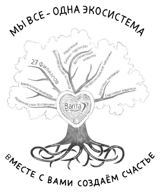 А может, книга не только о живых существах, но и о растениях? У «Валты» есть образ древа жизни для описания ценностной структуры компании. Заходишь к ним в офис, и слева на стене все как у Пушкина – дуб зеленый. Никакой цепи нет, никакой кот по ней не ходит и ничего не рассказывает. Тут все устроено по-другому. Любовь, лидерство, доверие, любопытство и другие корни питают крону, крона состоит из множества ветвей, а на ветвях шелестят тысячи листьев – это счастливые владельцы и здоровые питомцы. Вот про что эта книга.