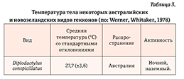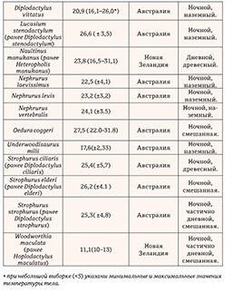 Для ночных и наземных видов важен нижний обогрев субстрата. Это связано в первую очередь со значительным влиянием на тело рептилий температуры поверхности субстрата и приземного воздуха (Четанов, 2010). Так как большинство гекконов являются ночными, которые получают тепло от нагретого за день субстрата, их высокая активность проявляется в первую половину ночи, либо в утренние часы. Температура тела новозеландских гекконов значительно ниже в ночное время, учитывая, что диапазон дневных и ночных температур достаточно высок (таблица 3). Ночная температура тела (ректальная) у Woodworthia maculata (ранее Hoplodactylus maculatus) составляла +10… +13 °С, а днем доходила до +33°C, что достигалось за счет нагретых камней в расщелинах скал. У дневного вида Naultinus manukanus (ранее Heteropholis manukanus) днем, во время баскинга на камнях, температура тела достигает +31°C, а ночью опускается до +8… +10 °С (Werner, Whitaker, 1978).