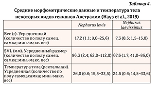 Ночные виды ящериц часто активны при температурах, которые считаются неоптимальными для функционирования организма, – феномен, который упоминается как «ночной парадокс» (Hays et al., 2019). Парадокс заключается в том, что установочные характеристики в физиологических системах терморегуляции, по всей видимости, не связаны с оптимальными температурами разных физиологических процессов в организме рептилий. В национальном парке Улуру-Ката-Тьюта (Северная территория Австралии) проводились замеры температуры тела двух видов гекконов Nephrurus levis и N. laevissimus (таблица 4). Несмотря на то, что эти виды обитают в различных биоценозах – Nephrurus levis отдает преимущество зарослям спенифекса и кустарника, а N. laevissimus – песчаным дюнам, средние температуры тела их были очень близки (N. laevissimus день +29,5°C, ночь +27,8°C; Nephrurus levis день +29,1°C, ночь +28,2°C). При этом температура тела обоих видов варьировала от +14,5°C до +33,6°C и значительно коррелировала с температурой воздуха и земли во время отлова (Hays et al., 2019).