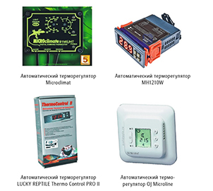 Для контроля температурного режима применяют программируемые автоматические терморегуляторы. Происхождение этих технических средств разнообразно, начиная от китайских производителей до самодельных устройств, вполне удовлетворяющих любителей и потребности рептилий по регулировке температуры в террариуме.