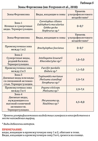 Гарри Фергюсоном с группой коллег на юге США и Ямайке провели исследования с более 15 видами ящериц и змей в различных экологических средах. Их результатом стало выделение четырех зон ультрафиолетового излучения, впоследствии названными зонами Фергюсона (Ferguson et al., 2010) (таблица 5).