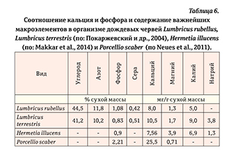 Мы специально не занимались разведением этих видов, но на сегодняшний день они считаются одними из лучших кормовых объектов по соотношению в организме кальция и фосфора (таблица 7). Кроме этого, в организме обыкновенной мокрицы формируется аморфная структура карбоната кальция (АКК), который в 10 раз более растворим и, соответственно, усвояем, чем природная форма карбоната кальция (CaCO₃) (Brecevic, Nielson, 1989) и характеризуется соотношением кальция и фосфора 11,5:1 (Neues et al., 2011).
