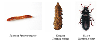 БОЛЬШОЙ МУЧНОЙ ХРУЩАК (TENEBRIO MOLITOR). В террариумистике в качестве корма используется личиночная форма жуков и куколка. Взрослых жуков гекконы отказываются употреблять в пищу, но его очень хорошо едят представители семейства Agamidae. Мучной хрущак проходит четыре стадии жизненного цикла: яйцо, личинка, куколка и взрослый жук. Размер личинки от 2,5 см и более, куколка около 1,5–2,0 см.