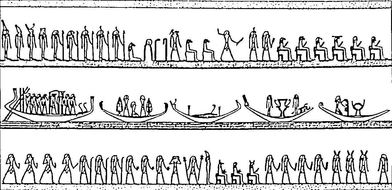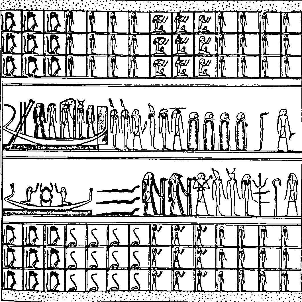 На другом берегу лодку встречают существа с головами кобры и с головами обезьяны, они олицетворяют мертвых в царстве мертвых.