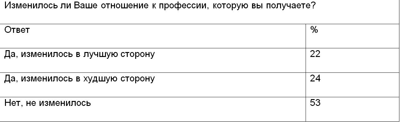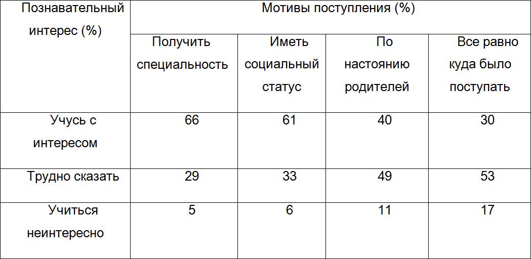 Исходя из данных, можно сделать следующий вывод: студенты, которые мотивированно пошли учиться, занимаются с большим интересом. Таким образом, начальная мотивация к овладению профессией определяет отношение к самому процессу обучения.