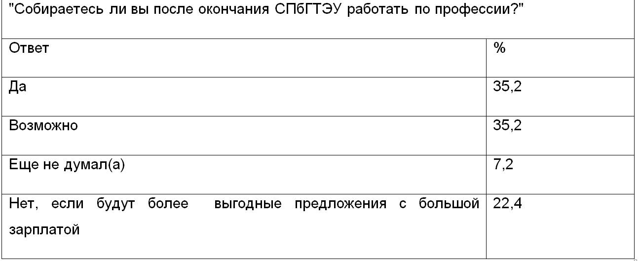 И в-третьих, хотя высшее образование является одним из обязательных требований к соискателям практически на любой работе, связанной с умственным трудом, само высшее образование нужно только в принципе , а уж какое именно – для компаний вопрос второстепенный. Поэтому молодые люди часто выбирают университеты и факультеты, на которые поступить проще всего и никогда не трудоустраиваются по специальности. Сказанное можно проиллюстрировать данными опроса выпускников СПбГТЭУ (участвовало 125 человек) :