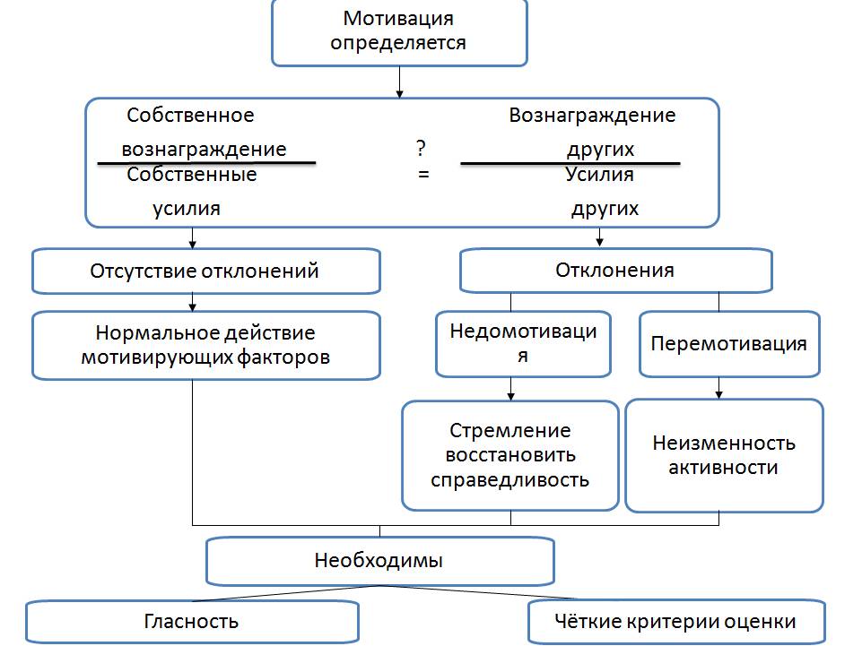 Работника больше всего интересует не абсолютный уровень его награды, а по сравнению со своими коллегами: «Какое вознаграждение я получу по сравнению с вознаграждением других, выполняющих такую же работу?». Человек в уме выводит определённое соотношение, характеризующее справедливость руководства по отношению к нему. Он чувствует, что к нему относятся справедливо, если отношение вознаграждений к затратам равны между собой.