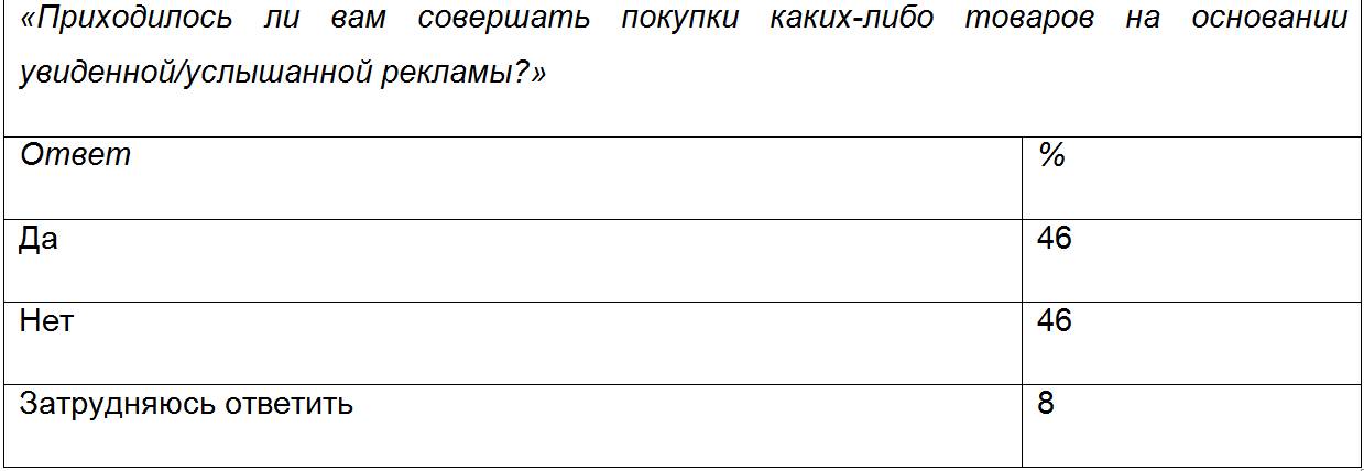 Таким образом, результаты исследования позволяют говорить о том, что хотя большинство населения оценивает рекламу негативно и испытывает недоверие к тому, что показывают, говорят или пишут в рекламе, доля людей, совершающих покупки на основе увиденной рекламы, высока: почти половина. Это свидетельствует о том, что декларируемое отрицательное отношение и недоверие к рекламе практически никак не сказывается на способности рекламы влиять на бессознательное покупательское поведение.