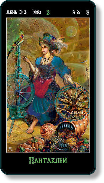 2 Пантаклей – поляризация материи, ее разъединение. Самая инертная из стихий – Земля – все же способна поддаваться изменениям, что является реализацией ее высшего потенциала. Реальное воплощение того, что никогда не существовало ранее. Неисчерпаемый рог изобилия духовных и материальных благ, принцип изначального движения, непрерывного вращения «колеса Госпожи Удачи». Незнакомая область реализации или повод к действию. Профессиональный успех, дипломатия, двойственность, любовь к работе.