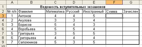 2) Заполните формулами пустые ячейки.Абитуриент зачислен в институт, если оценка по математике 4 или 5, в противном случае – нет.