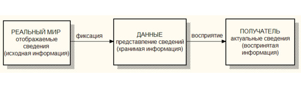 Способом, обеспечивающим доступность знаний, информации разным людям, является представление и хранение информации в виде данных на материальном носителе. Таким образом, вся информация, употребляемая человечеством в его деятельности, воплощающая интеллектуальный и духовный потенциалы человечества, хранится в форме данных. Отсюда следует, что и третий компонент информационной коммуникации (данные) может рассматриваться как вид представления информации – хранимая информация (см. схему на рис.1.2.).